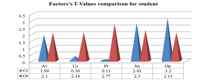 Fig.2 shows that comparative chart of calculated t values (Ct) and observed t value (Ot) of ICT factors for stakeholders. For availability (Av), usability (Us) and problem (Pr) factor we can see that calculated t value is smaller than observed t value (Ct|<|Ot) which shows not significant at 5% level. But when we talk about solution (Sn) and opportunity (Op) factor, we found significant at 5% level due to greater calculated t-value from observed t-value (Ct|>|Ot). It can be concluded that affiliation status of university affected the opinions of students towards solution (Sn) and opportunity (Op), but in case of availability (Av), usability (Us) and problem (Pr) factor, opinions of stakeholders are identical almost.