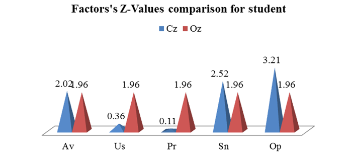 Fig. 3 is s comparing the calculated z values (Cz) and observed z value (Oz) of ICT factors for student. For usability (Us) and problem (Pr) factor, the authors found no significant difference among students for their university affiliation status at 5% confidence level due calculated z value is smaller than the observed z value (Cz|<|Oz). But in case of availability (Av), solution (Sn) and opportunity (Op) factors, we found significant difference among students for their university affiliation status at 5% level, due to the greater calculated z-value from observed z-value (Cz|>|Oz). It is found that affiliation status of university influenced the opinions of students towards solution (Sn), availability (Av) and opportunity (Op).