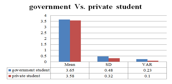 The Fig. 4 shows difference between the mean, standard deviation and variance of students towards ICT. The above chart shows that students from government Institutions have little bit more positive attitude towards ICT as compare to students of private institutions. The much scatteredness can be seen in responses of government students as compare to private students due higher SD (Standard Deviation).